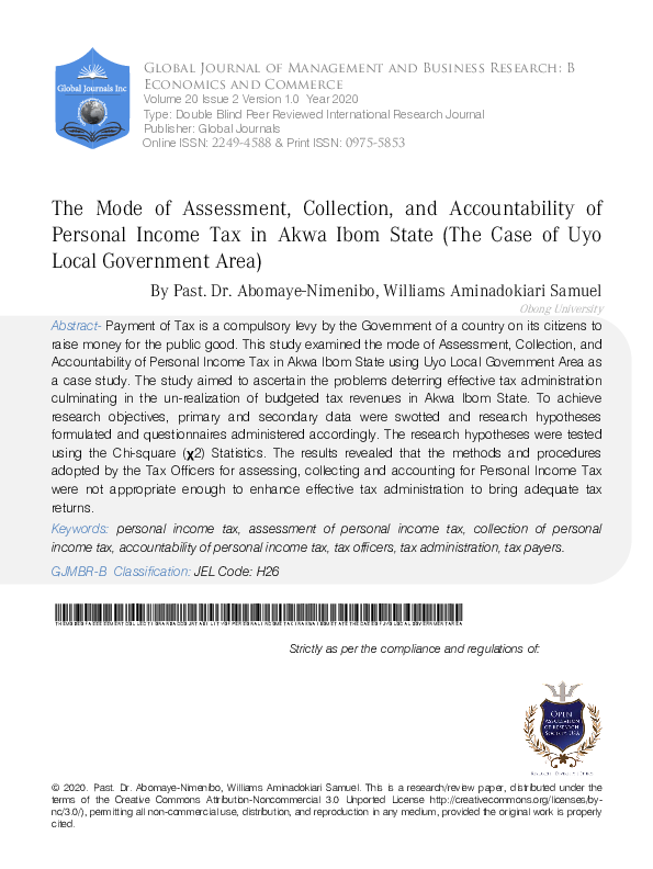 Pdf The Mode Of Assessment Collection And Accountability Of Personal Income Tax In Akwa Ibom State The Case Of Uyo Local Government Area Akwa Ibom State Williams Abomaye Nimenibo Phd Academia Edu